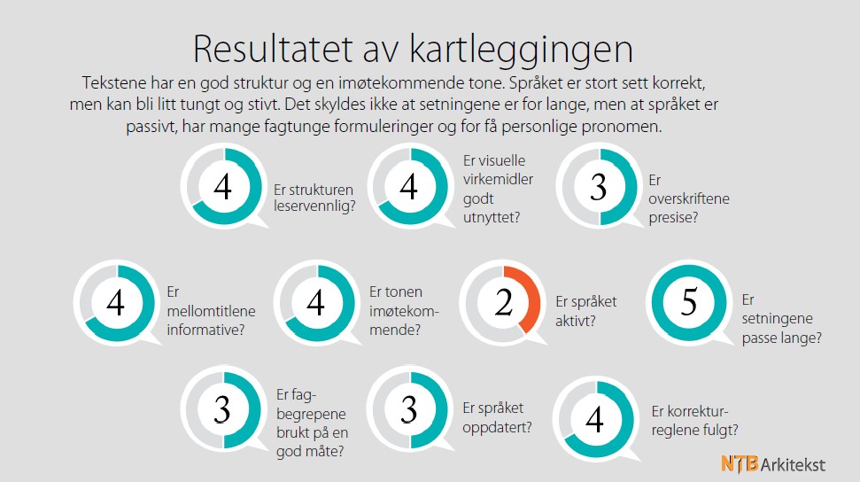 I første fase av prosjektet leverte livselskapene som var med i arbeidsgruppen et utvalg av egne tekster. Disse ble kartlagt av profesjonelle konsulenter, og selskapene fikk hver sin rapport med konkrete forslag til språkforbedring. Tekstene ble vurdert etter ti kriterier, og tilbakemeldingen ble visualisert slik at det skulle være enkelt for selskapene å bruke resultatene i pedagogisk øyemed.