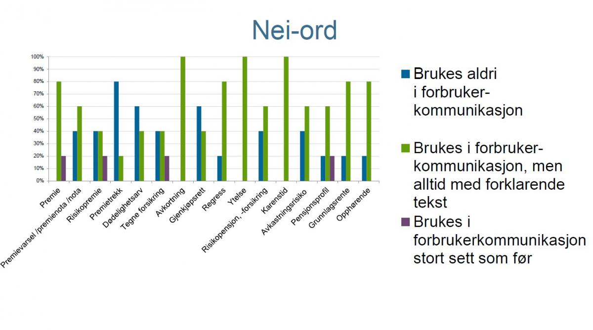 Det ble til og med trukket ut noen ord som ble omtalt som «nei-ord», det vil si ord som helst ikke skulle brukes lenger i kommunikasjon med forbruker. Det var ord som «premie», «dødelighetsarv», «avkortning», «risikopensjon» og «grunnlagsrente».