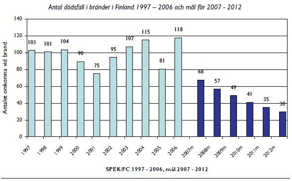 Om den nuvarande utvecklingen fortgår beräknas det årliga antalet dödsfall i bränder öka till minst 140–150 fram till år 2025. Situationen för Finlands del är verkligen dyster i jämförelse med andra länder. I Finland omkommer drygt 2 personer per 100.000 invånare, medan motsvarande siffror i de övriga nordiska länderna är 1,4–1,5 och i Storbritannien ca 1,0.