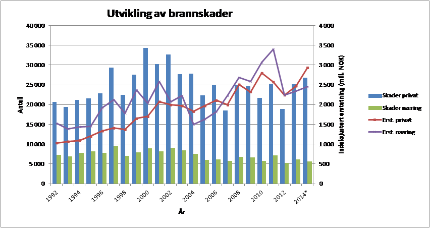 Forsikringsselskapenes felles brannstatistikk for årets første tre kvartaler viser samtidig at antall og erstatninger knyttet til materielle brannskader øker igjen etter en betydelig nedgang i foregående år. Erstatningene i år er etter tre kvartaler på nesten 3,5 milliarder kroner, en økning på nesten ti prosent. Økningen gjelder særlig for villa-, hjem- og hytteforsikringer.