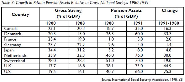 Hughes (1999, p51) lists “Pension Assets/ GNP” versus “National Savings/GNP” for sixteen countries, and finds that there is no correlation between pension assets and Net National Savings at all. This is supported by work done by the International Social Security Association (1998, p21) in Table 3.