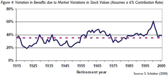 Second, all of the risks of a DC plan, including the investment risk, the inflation risk, and the longevity risk fall on the shoulders of the individual worker instead of being shared across the entire working population. As a result one should expect workers to invest in relatively low risk investments resulting in lower long-term rates of return than modeled by proponents of these reforms. This is extremely important since every 1 percent of extra return over the lifetime of a worker results in a pension that is about 24 percent larger (Adams, 1967). Schieber (2000) illustrates the risk-bearing element well in Figure 4 where he shows the replacement ratio that a worker would realize if s/he had saved 6 percent of pay each year over a forty-year working lifetime (shown by year of retirement at age 65).