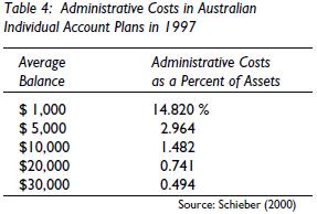 3.Administrative costs are usually very low per unit of cash flow, much lower than for private plans. Plus, Individual Account expenses are always larger for smaller balances leading to a regressive system.