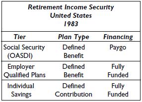 Using the U.S. as our example, we compare the diversity of their financial security systems at two times. In 1983, the U.S. had a mix of DB and DC plans plus a mix of paygo and full funding. Clearly, this is a diversified system.
