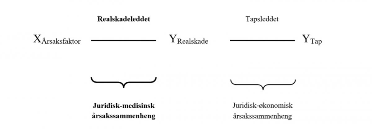 Hovedtyngden i artikkelen ligger på det første årsaksleddet, hvilket er markert med fet i figurens venstre del. I dette «realskadeleddet» står man overfor det jeg kaller en «juridisk-medisinsk årsakssammenheng». Det andre årsaksleddet er mellom realskaden og det økonomiske tapet, se «tapsleddet» i høyre del. Her er det en «juridisk-økonomisk årsakssammenheng», hvor årsaksvurderingen glir over i erstatningsutmålingen. Begrepene har en pedagogisk funksjon,[2] for eksempel i fremstillingen av domsmaterialet. I Nakkesleng IV (Rt. 2010 s. 1547) kom retten til at det var årsakssammenheng mellom trafikkulykken og deler av skadebildet svarende til 5 prosent varig medisinsk invaliditet (realskadeleddet), men at det ikke var årsakssammenheng mellom denne begrensede realskaden og det økonomiske tapet (tapsleddet).