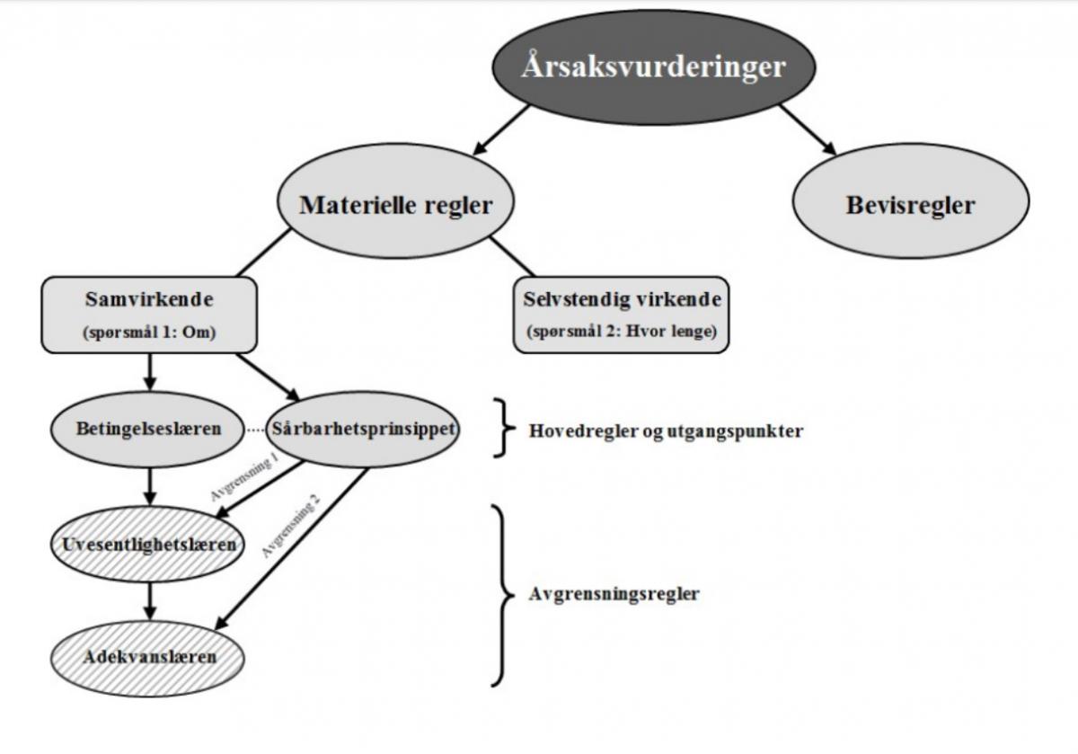 Det første hovedspørsmålet er om det overhodet foreligger årsakssammenheng, se venstre rektangel i figuren. Utgangspunktet for vurderingen er betingelseslæren, som bygger på et logisk årsakskrav. Det er oppfylt hvis ansvarshendelsen er en nødvendig betingelse for skaden. Betingelseslæren suppleres av en spesiell hovedregel, som gjelder der skadelidte har en fysisk og/eller psykisk sårbarhet (og derfor er mer mottakelig for skade enn normalt). Hovedregelen er at skadevolder har risikoen for skadelidtes særlige sårbarhet – skadevolder må «ta skadelidte som han/hun er». Dette «sårbarhetsprinsippet» kan betraktes som et utslag av betingelseslæren. Til disse to utgangspunktene kommer det supplerende avgrensningslærer (kan betraktes som unntak). Den ene avgrensningslæren er uvesentlighetslæren (den modifiserte hovedårsakslæren), som stiller minstekrav til ansvarshendelsens bidrag til skaden. Dersom årsaksbidraget er helt minimalt, blir ansvarshendelsen sjaltet ut som rettslig irrelevant selv om den er en nødvendig betingelse. Den påståtte skadevolderen må da frifinnes. Hvis skadelidte passerer dette «hinderet», er man over i en vurdering av den andre avgrensningslæren: adekvanslæren. Den anviser en bred interesseavveining, hvor man må vurdere en rekke momenter for å avgjøre om erstatningen skal reduseres eller bortfalle.