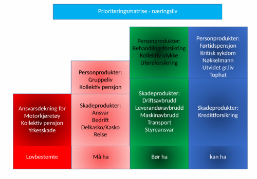 Kort sagt bør enhver virksomhet ha et bevisst forhold til sin egen risikoeksponering for på denne måte å kjøpe forsikringsdekninger som er relevante for virksomheten sett i forhold til risikobærende evne og vilje. De bør gradere forsikringsdekningene i forhold til hva som er lovbestemte forsikringer, hva bedriften «må ha», hva bedriften «bør ha» og hva bedriften «kan ha». Personforsikringer bør vurderes etter de samme kriterier, men også ta hensyn til hva som er vanlig i bransjen. Dette bør fremkomme i en personalforsikringspolicy som er kjent for de ansatte med hensyn til hvem som er forsikret, hva forsikringen dekker, hvor stor er erstatning og hvem skal motta erstatningen.